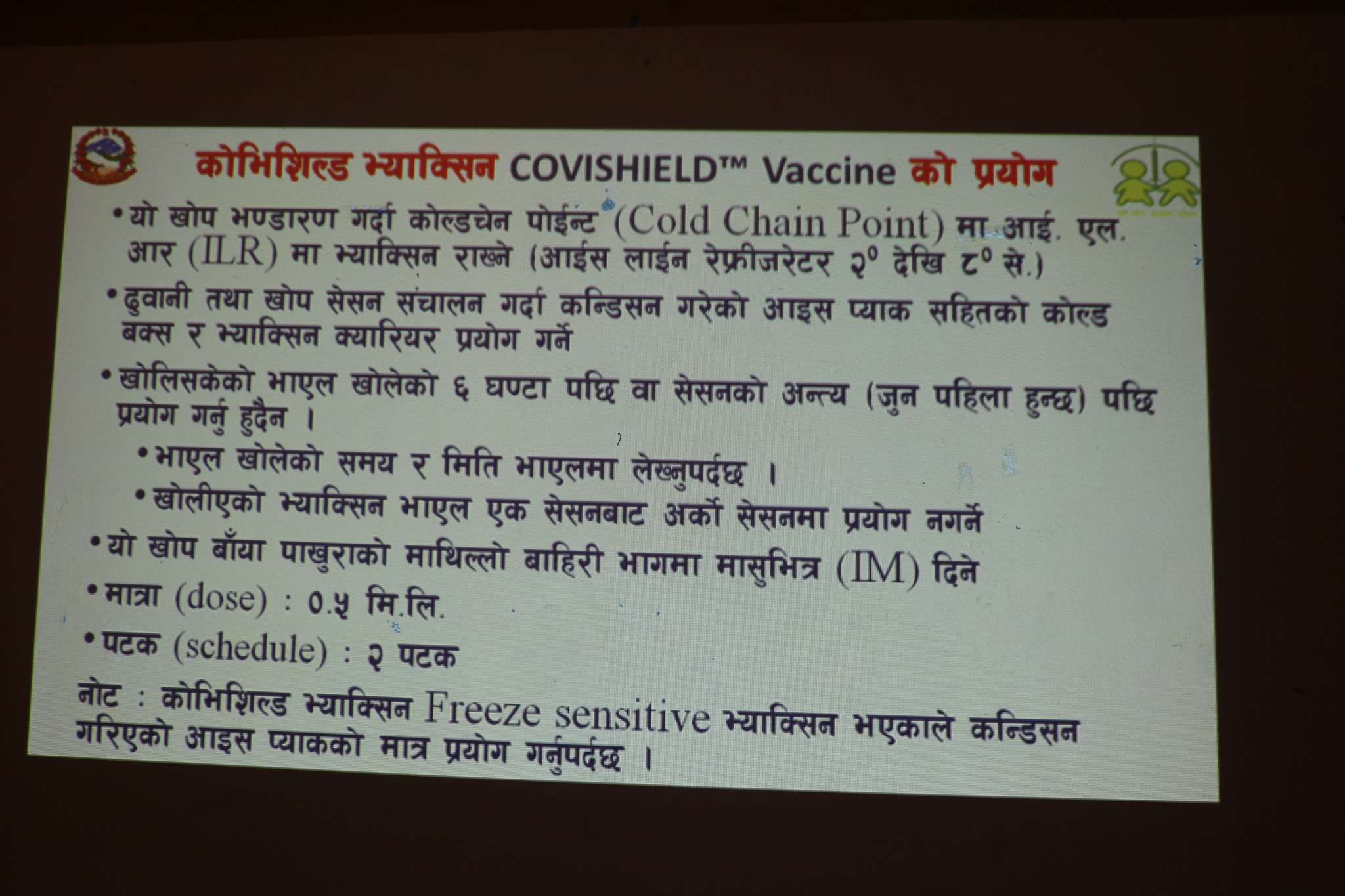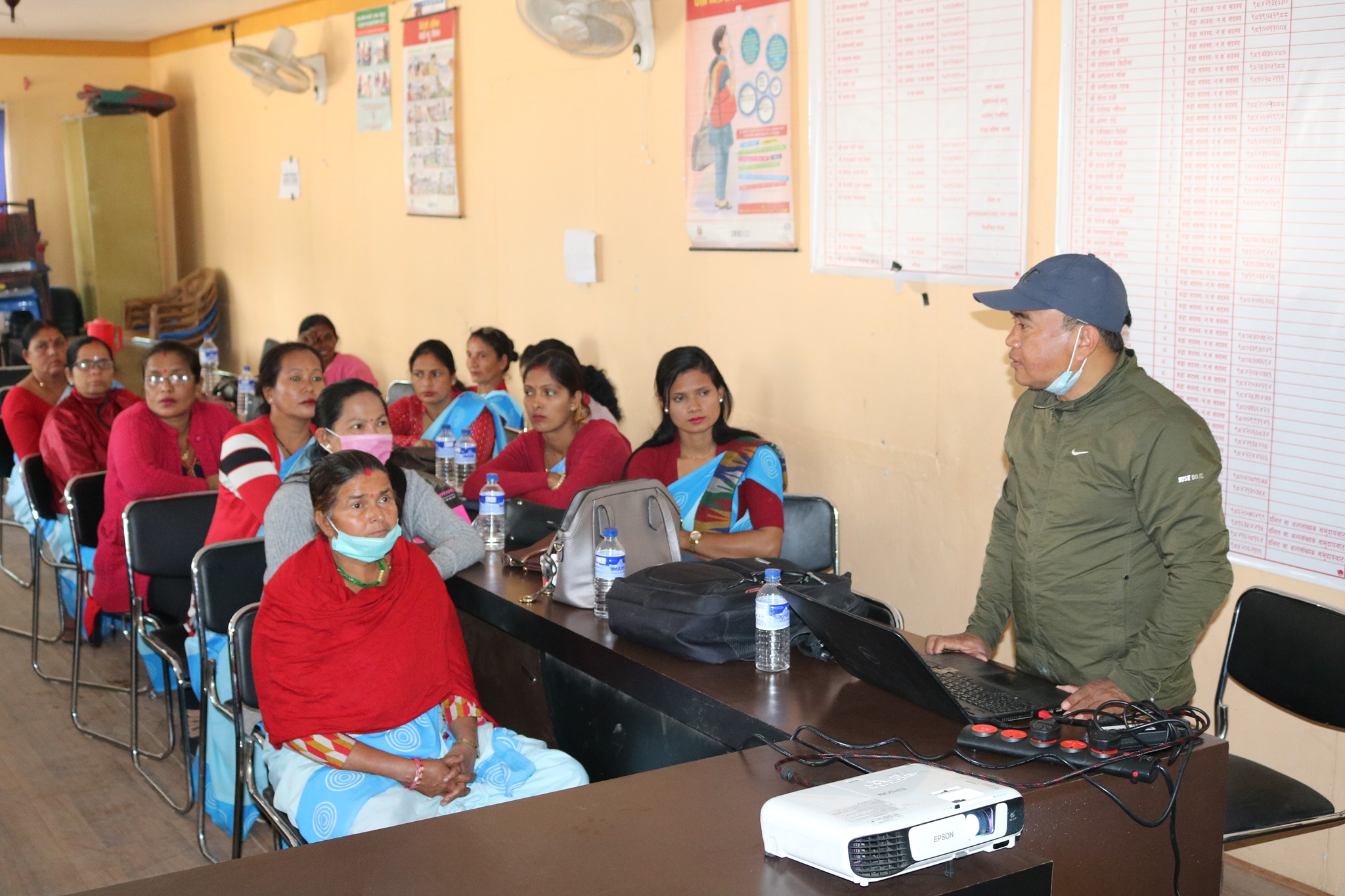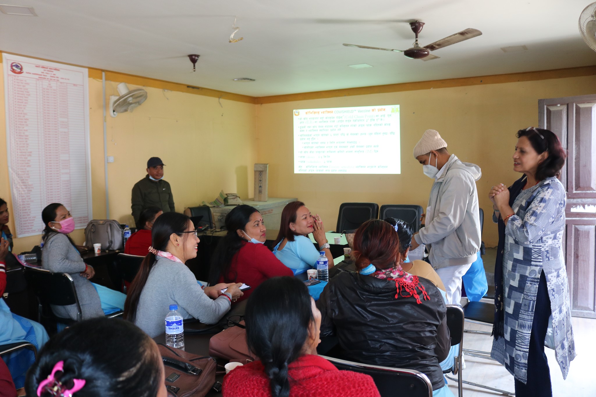 नगर उपप्रमुख यमुना विष्ट वास्तोलाको उपस्थितीमा नगरको स्वास्थ्य शाखाले आयोजना गरेको तालिममा स्वास्थ्य कर्मचारी जगत मगर र एकराज खत्रीले सहजिकरण गर्नुभयो । उहाँहरुले टोल टोलबाट खोपकेन्द्रमा लक्षित समूहलाई भेला गराउन र खोप लगाउने स्वास्थ्यकर्मीका लागि सहयोग पुर्याउनु पर्ने जनाउँदै सहित कोरोना र यसको खोपका बारेमा जानकारी गराउनु भयो ।